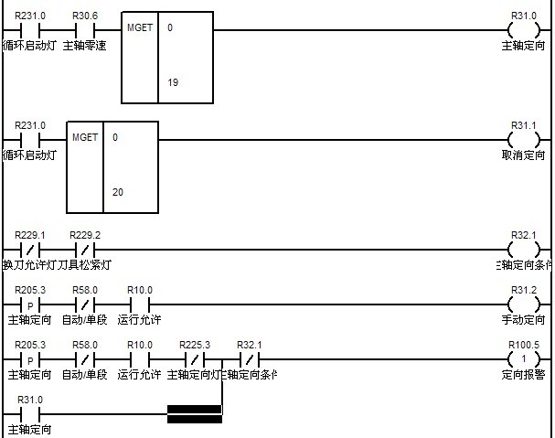 ????? 主軸定向功能可以通過M代碼開始,也可以通過手動方式下面板的按鍵開始。定向的開始條件為主軸轉速必須處于零速度。主軸定向開始時將通過置主軸定向標志G402.12,定向完成以后通過清除該標志來取消定向,以便下一次定向的開始。如果換到松緊燈亮時,不允許主軸定向,否則報警。