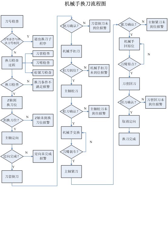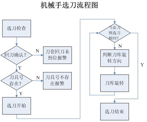 ?????? 機械手動作基本流程可以分解為選刀過程和換刀過程,選刀動作必須在換刀動作之前完成。選刀動作主要是負責選取指定的刀號的刀具,旋轉刀庫到指定刀具位置,然后等待換刀動作開始。換刀動作主要負責將刀庫上選定的刀具和主軸上的刀具進行交換的動作。