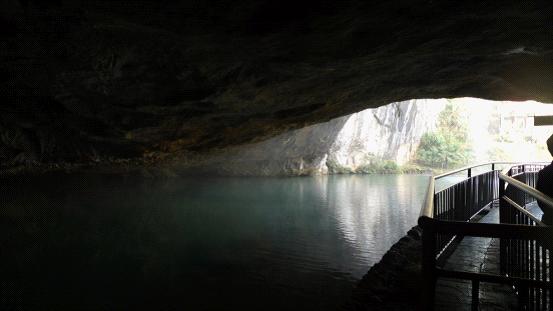 走過長長的棧道,來到洞口。一道水簾從洞口傾瀉而下,恍若西游記的水簾洞。一條小河在腳底下緩緩流淌,河水清澈見底,河邊還有洗衣婦,邊洗衣服,邊打量著過往游客。